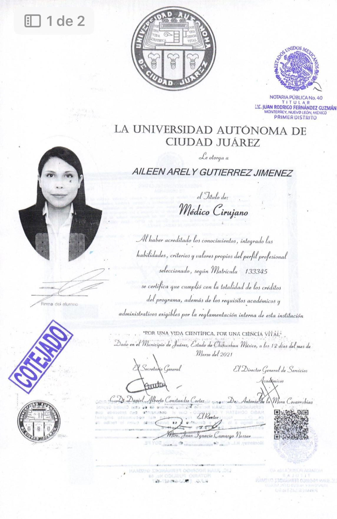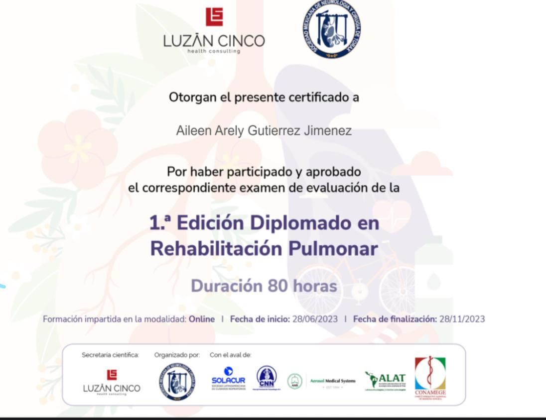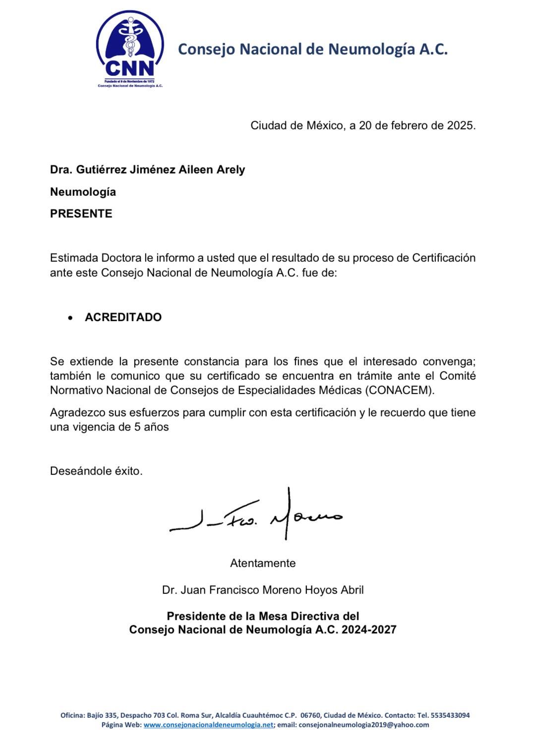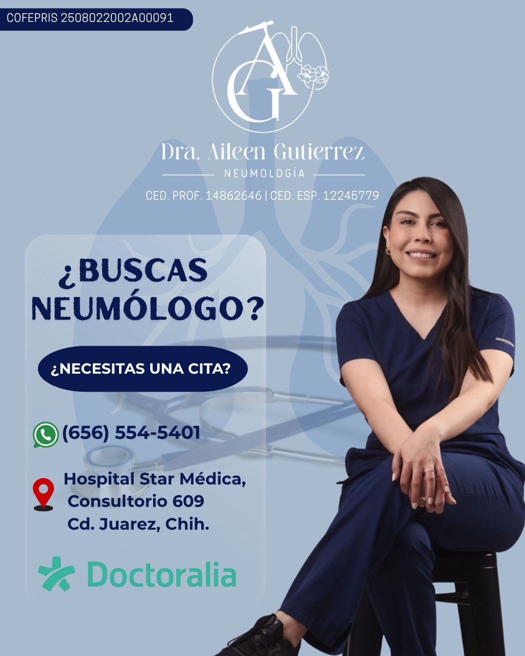 Soy médico cirujano egresada de la Universidad Autónoma de Ciudad Juárez, con especialidad en Neumología por la Universidad de Monterrey, realizada en la Unidad Médica de Alta Especialidad No. 34. Estoy certificada por el Consejo Nacional de Neumología.